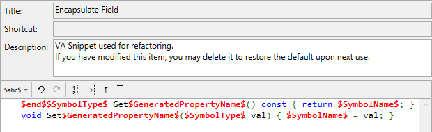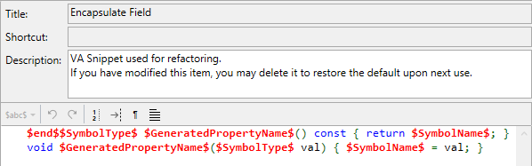The VA Snippets for refactoring and code generation make heavy use of reserved strings that expand when invoked. Many of the reserved strings are unique to refactoring and code-generation, and cannot be used in VA Snippets of other types.