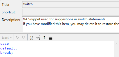 The VA Snippet for "switch" contains a list of suggested labels when programming switch statements.