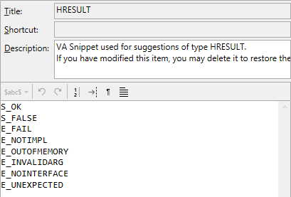 The remaining VA Snippets that support Smart Suggestions define value that Visual Assist may offer when you assign or compare variables of built-in or user-defined types. For example, when you define a variable of type HRESULT, Visual Assist uses the VA Snippet for "HRESULT" to suggest initial values.